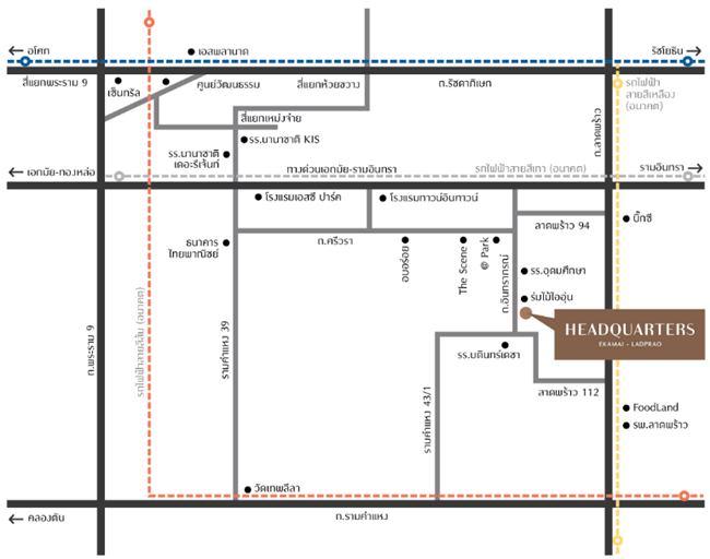 ภาพรวมในด้านทำเล โครงการ HEADQUARTERS Ekamai-Ladprao ตั้งอยู่บนทำเลที่ดีในย่านทาวน์อินทาวน์ รายล้อมด้วยศูนย์กลางความเจริญในย่านทาวน์อินทาวน์ มี Community Mall, โรงเรียน, โรงแรม, ร้านกาแฟ และร้านอาหารเก๋ๆ มากมาย อาทิเช่น The Scene Town in Town, @Park Town in Town, โรงเรียนบดินทรเดชา (สิงห์ สิงหเสนี), ร้านกาแฟร่มไม้ไออุ่น, Tesco Lotus Express และโรงแรมทาวน์อินทาวน์ สามารถเดินทางติดต่องาน และเข้าออกเมืองได้สะดวกด้วยทางด่วนรามอินทรา-อาจณรงค์ ด่านฯ ประชาอุทิศ (ห่างจากโครงการเพียง 1.6 กม.) และโครงการรถไฟฟ้า 3 สาย ในอนาคต (สายสีเทา, สีส้ม และสีเหลือง) ในระยะห่างจากโครงการไม่ถึง 2 กม. นอกจากนี้ยังมีทางลัดไปออกถนนรามคำแหง, ถนนลาดพร้าว และถนนเลียบด่วนฯ ได้หลายเส้นทางอีกด้วย ทำให้เป็นทำเลโครงการบ้านที่น่าสนใจมากอีกโครงการนึงเลยค่ะ หากโครงการมี Update เพิ่มเติม ทาง CheckRaka.com จะเก็บมาฝากนะคะ แล้วพบกันใหม่กับพรีวิวชมทำเลบ้านใหม่ค่ะ