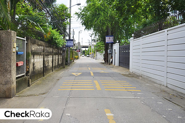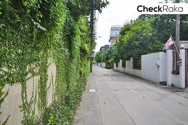 บรรยากาศภายในซอยสุขุมวิท 62/1 ค่อนข้างร่มรื่นและเงียบสงบค่ะ มีต้นไม้เขียวครึ้มจากภายในบ้านพักอาศัยตลอดทาง