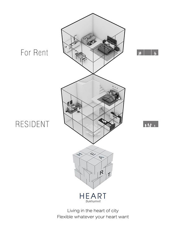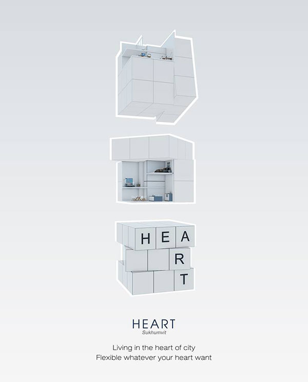 HEART SUKHUMVIT เป็นทาวน์โฮมแต่ทำเลคอนโด ผ่านแนวคิดใหม่ ตอบโจทย์ความเป็น High Technology เพียง 9 ยูนิตเท่านั้น สามารถบิดเปลี่ยนฟังก์ชั่นการใช้งานได้ตามใจชอบ โดยออกแบบให้แต่ละชั้นแยกออกจากกัน โดยมีลิฟต์เป็นตัวเชื่อม แต่ละชั้นจะเต็ม Privacy รองรับการขยายของครอบครัว หรือปล่อยเช่าก็ได้ และทีสำคัญยังได้บริษัทออกแบบชื่อดังอย่าง ATOM Design มาออกแบบงานสถาปัตยกรรมในครั้งนี้ด้วย