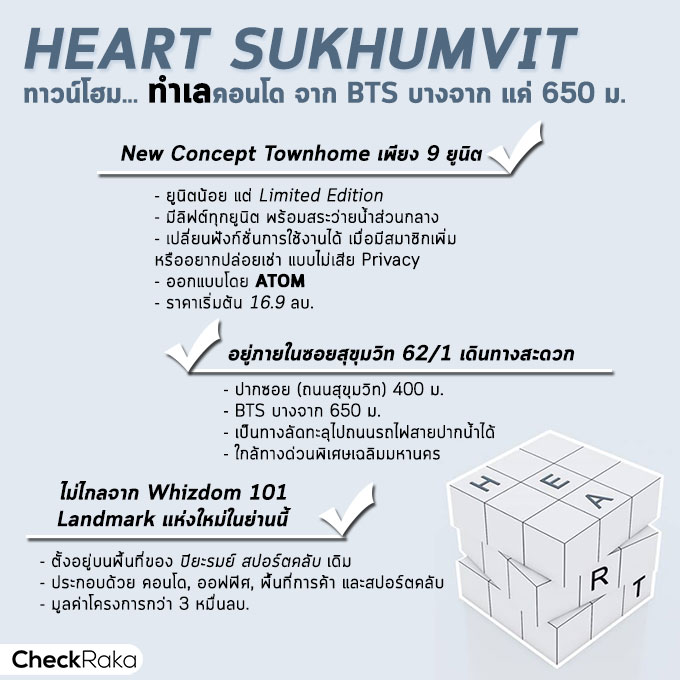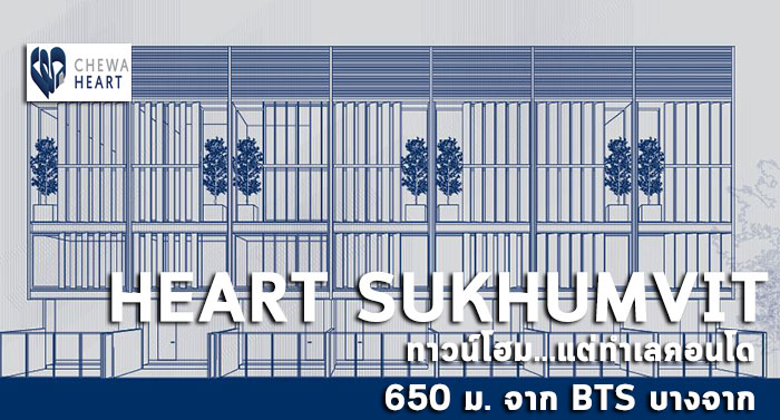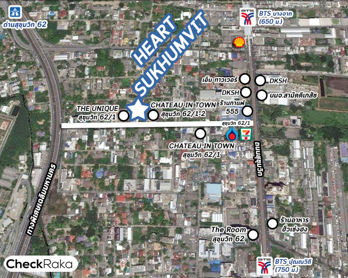 HEART SUKHUMVIT เป็นโครงการ Joint Venture ระหว่าง บริษัท ชีวาทัย จำกัด (มหาชน) และ Blogger คอนโดชื่อดัง คุณขจิต ล้วนพิชญ์พงศ์ หรือ "Condoman" นั่นเองค่ะ ตั้งอยู่ภายในซอยสุขุมวิท 62/1 ห่างจากปากซอยประมาณ 400 ม. และห่างจากรถไฟฟ้า BTS สถานีบางจากประมาณ 650 ม. เดินทางสะดวกทั้งขนส่งสาธารณะและไม่ไกลจากทางด่วนเฉลิมมหานคร มีร้านสะดวกซื้อ 7-Eleven ในระยะเดินเท้าได้สบายๆ และในอนาคตยังมี Whizdom 101 Mixed use คอมมูนิตี้มอลล์และคอนโดโครงการใหญ่ ใกล้รถไฟฟ้า BTS สถานีปุณณวิถี ซึ่งน่าจะะทำให้ย่านนี้คึกคักมากขึ้นอย่างแน่นอน