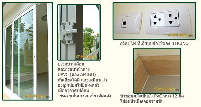 ในส่วนของวัสดุ มีหลายชิ้นที่ให้ของคุณภาพใช้ได้เลย เช่น กรอบประตู บานหน้าต่าง UPVC หรือสุขภัณฑ์ และก็มีวัสดุบางชิ้นที่เลือกใช้ของในระดับที่พอใช้งานได้อย่างพวกลูกบิดประตู บานประตู สวิตซ์ไฟ แต่จากที่สำรวจมาก็ถือว่าไม่ได้เลือกใช้วัสดุที่ไม่ถึงกับเรียกว่า "ไม่สมราคา" นอกจากนี้ อย่าลืมว่าโครงการนี้เน้นขายบ้านเปล่า ดังนั้น เจ้าของบ้านส่วนใหญ่ก็อาจแต่งบ้านใหม่อยู่แล้ว และวัสดุบางอย่างก็น่าจะถูกปรับเปลี่ยนไปตามรสนิยม และการตกแต่งบ้านแบบใหม่ของเจ้าของบ้านได้ ส่วนที่ควรให้ความสำคัญอย่างงานโครงสร้างที่แข็งแรง และงานพื้น (ซึ่งเราก็ควรให้ความสำคัญไม่น้อยไปกว่าเรื่องวัสดุที่เปลี่ยนไปเปลี่ยนมาได้ไม่ยาก) ซึ่งในจุดนี้ ก็ถือว่ากัสโต้ก็ได้ให้ความสำคัญ และก่อสร้างบ้านออกมาได้ตามมาตรฐานการควบคุมของ Q House และเหมาะสมกับราคาใช้ได้ทีเดียว