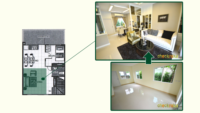 ทาวน์โฮมจริงขายแบบบ้านเปล่า แต่เรานำภาพของบ้านตัวอย่างที่แต่งแล้วมาเปรียบเทียบให้ดูจะได้นึกภาพตามได้ง่ายๆ เปิดประตูบานเลื่อนเข้ามาด้านหน้าเจอห้องรับแขก และส่วนทานข้าวที่อยู่ด้านใน ส่วนภาพบ้านเปล่าเป็นแปลงมุมเลยได้หน้าต่างด้านข้างเพิ่มมา 4 บาน แถมมีพื้นที่สวนข้างๆ ด้วย ชั้นล่างนี่เพดานสูง 2.80 เมตรโปร่งดี บ้านตัวโชว์ผนังจะติดวอลเปเปอร์ และ Built in กระจกกั้นห้องรับแขกกับส่วนทานข้าว แต่บ้านเปล่าที่เราซื้อนี่จะได้ห้องโล่งๆ ผนังทาสีภายในแบบกันความร้อนสีครีม ของ BAYER ส่วนพื้นเป็นแกรนิตโต้แผ่นใหญ่เกรดดีหนา 4 มิล