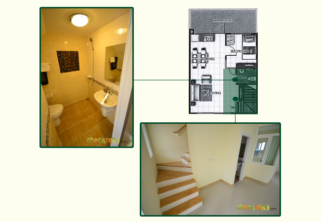 ฝั่งของห้องรับแขกด้านบันไดทางขึ้น มีการเจาะช่องรับแสงติดกระจกบานตายไว้ตรงผนังหน้าบ้าน ห้องน้ำชั้นล่างอยู่ข้างใต้บันได พื้นห้องน้ำใช้กระเบื้องผิวด้านกันลื่นสีน้ำตาลอ่อน ส่วนข้างฝาเป็นกระเบื้องผิวมันสีอ่อน ตกแต่งเพิ่มลายและลูกเล่นด้วยกระเบื้องโมเสค ส่วนสุขภัณฑ์ในห้องน้ำใช้ของนำเข้ายี่ห้อ VICTOR ทุกชิ้น
