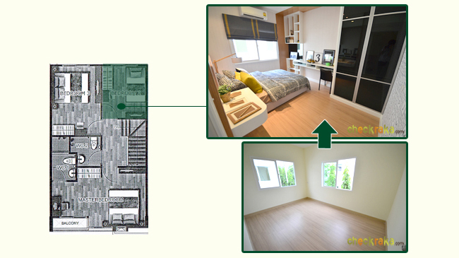 สุดท้ายเป็นห้องนอนที่ 3 ขนาดห้องและตำแหน่งการจัดวางผังของโซนนี้ของบ้านทั้งแบบ Type A และ Type B แทบจะไม่แตกต่างกันเลย ห้องนี้ขนาดจะค่อนข้างกะทัดรัด ออกแนวยาวแต่หน้าแคบ ห้องแต่งโชว์เลยจัดเตียงเล็กเข้ามุมใช้พื้นที่เต็มฝั่งข้างหน้าต่าง ซึ่งพื้นที่ค่อนข้างกะทัดรัดจะจัดวางเฟอร์นิเจอร์ให้คุ้มคงต้อง Built in น่าจะลงตัวสุด