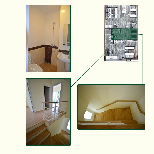 โถงบันไดทางขึ้นมาชั้น 2 ส่วนนี้มีช่องเพดานสูงสุดที่ 7.20 เมตร ออกแบบให้ดูโปร่ง โล่ง ลมระบายได้ดี ตัวโครงสร้างบันไดเป็นคอนกรีตเสริมเหล็ก ส่วนพื้นสัมผัสและราวบันไดเลือกใช้ไม้ประสานอัดด้วยน้ำยา เมื่อขึ้นมาข้างบนจะเจอกับห้องน้ำที่ชั้น 2 ซึ่่งบ้านทั้งสองแบบของกัสโต้จะตกแต่งด้วยวัสดุ และใช้สุขภัณฑ์ในห้องน้ำแบบเดียวกัน แตกต่างกันตรงที่ขนาดและฟังก์ชั่นการใช้งานของประตู โดยห้องน้ำชั้น 2 ของบ้าน TYPE A จะมีขนาดกว้างกว่า และมีประตูเข้า-ออกสองบานโดยบานนึงใช้เปิดเข้า-ออกจากข้างนอก ส่วนอีกบานนึงเชื่อมต่อกับห้องนอน Master Bedroom ในส่วนพื้นบ้านชั้นบนปูลามิเนตหนา 8 มิล โดยข้างใต้ปูแผ่นโฟมหนา 3 มิลให้อีกชั้นเพื่อช่วยกันความชื้นจากโครงสร้าง และเลือกใช้บัว PVC ที่มีคุณสมบัติไม่กลัวน้ำ ช่วยป้องกันความชื้นจากภายนอกอีกแรง