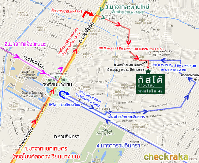 เส้นทางที่ 4 (มาจากรามอินทรา) - หากมาจากทางรามอินทรา พอใกล้ถึงวงเวียนบางเขน ไม่ต้องขึ้นสะพานข้ามวงเวียน ให้ชิดซ้ายเพื่อกลับรถใต้สะพานข้ามแยกวงเวียน พอกลับรถมาแล้วให้ตรงไปอีกประมาณ 850 ม. (เซ็นทรัลรามอินทราจะอยู่ทางซ้ายมือ) เลี้ยวซ้ายเข้าซอยรามอินทรา 5 ตรงไปเรื่อยๆ ตามทางประมาณ 1.9 กม. จะถึงแยกศาลพ่อเสือ ให้เลี้ยวซ้ายแล้วตรงไปอีกประมาณ 1.3 กม. เลี้ยวซ้ายเข้าซ.พหลโยธิน 48 แยก26 ตรงเข้าซอยไปอีก 140 ม. ก็จะถึงโครงการ