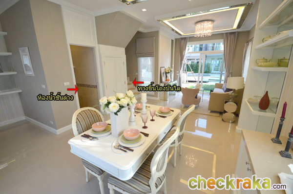 ส่วนทานข้าวโชว์เพดานบ้านโปร่งๆ ที่ทำให้การตกแต่งโคมไฟและการดรอปฝ้าเพดานดูโดดเด่น