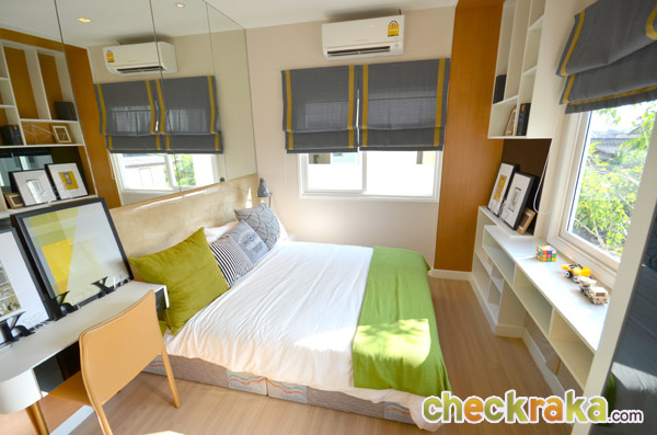 เขยิบขึ้นมาคือห้องนอนขนาดรองที่มีขนาดพื้นที่ห้องกว้างขึ้น ตกแต่งและจัดวางเฟอร์นิเจอร์แล้ว