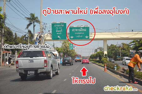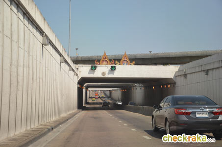 ให้ดูป้ายสะพานใหม่ไว้เพื่อเตรียมลงอุโมงค์ (วัดพระศรีมหาธาตุจะอยู่ทางซ้ายมือ)