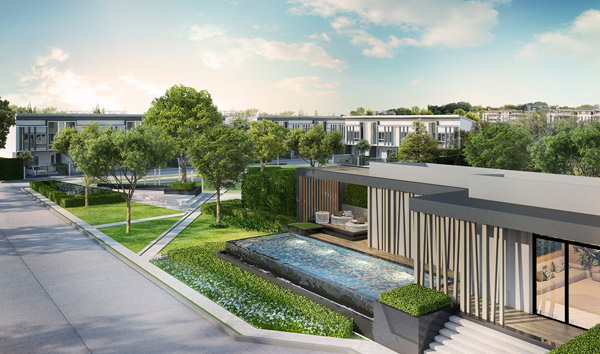 ภาพจำลองสระว่ายน้ำ และอาคารนิติบุคคลที่ออกแบบให้กลมกลืนกันไปกับคอนเซปต์ Natural Weaving