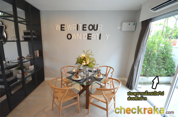 พื้นที่ด้านท้ายของบ้านเป็นส่วนทานอาหาร ส่วนขวามือเป็นประตูบานเลื่อนไว้เปิดออกไปส่วนซักล้างที่หลังบ้าน