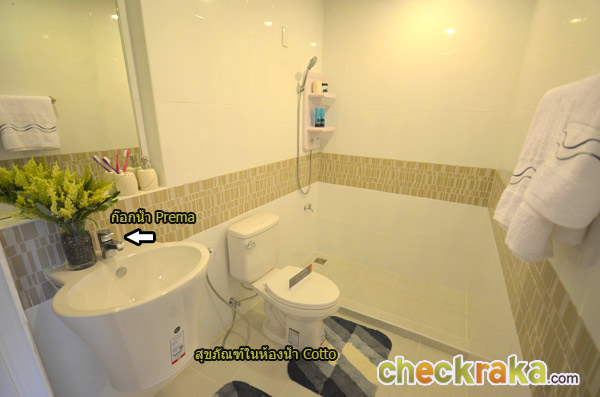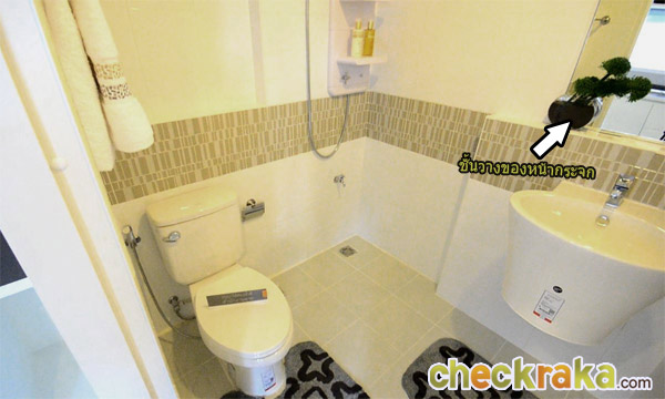พื้นกระเบื้องและผนังภายในห้องน้ำเป็นกระเบื้องขนาดมาตรฐานสีครีมออกขาว ผนังติดกระเบื้องเต็มฝาสีขาว ตัดลายเส้นกลางแบ่งกลางพื้นที่ด้วยกระเบื้องลายโมเสคเรียบง่ายสะอาดตาดี