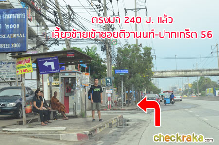 ตรงมาอีกประมาณ 240 ม. แล้วเลี้ยวซ้ายเข้าซอยติวานนท์-ปากเกร็ด56 (ซ.พระแม่มหาการุณย์)