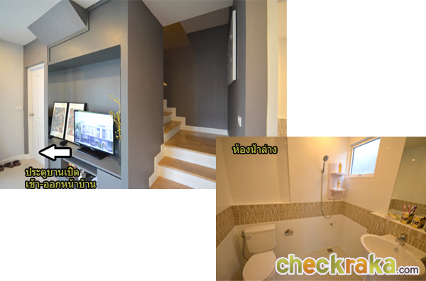 รูปซ้ายมือคือมุมประตูทางเข้า-ออกที่หน้าบ้าน และโถงทางขึ้น-ลงบันได ส่วนรูปขวามือเป็นภาพรวมของห้องน้ำชั้นล่าง