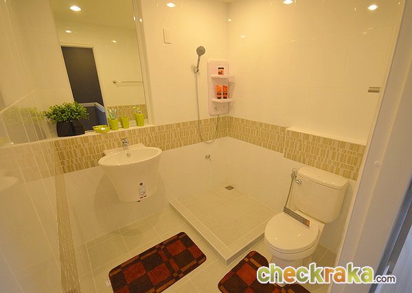 ภายในห้องน้ำชั้น 1 ที่หลบมุมอยู่หลังพื้นที่ครัวตกแต่งแบบเดียวกันกับบ้าน Type เล็ก