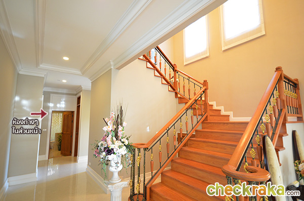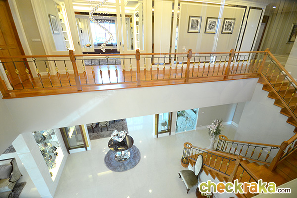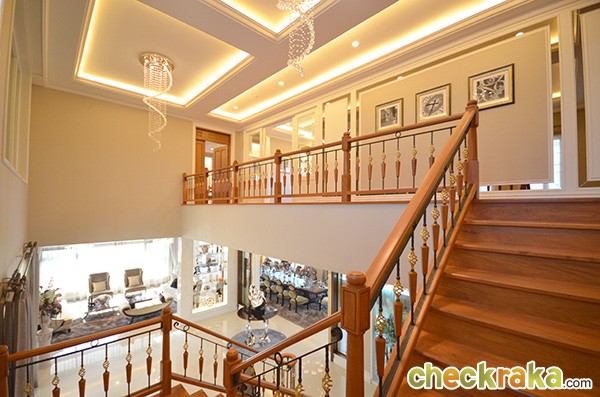 โถงบันไดสูงโปร่งเกือบ 8 เมตร สวยๆ ที่เห็นนี้เป็นบันไดโครงสร้างคอนกรีตเสริมเหล็ก และไม้ที่ใช้เป็นไม้มะค่าแผ่นใหญ่