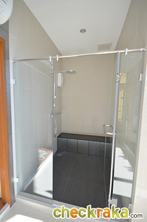 ภายในห้องน้ำแยกส่วนเปียกด้วยฉากกั้นกระจก ภายในมีที่นั่งอาบน้ำมาให้เรียบร้อยค่ะ