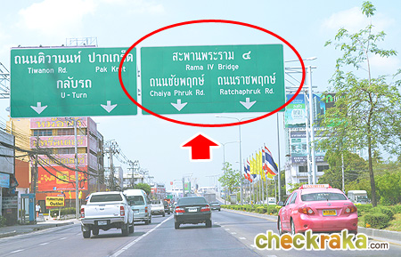หากตรงมาจากถนนแจ้งวัฒนะมุ่งหน้าสู่แยกปากเกร็ดให้ชิดขวายึดป้าย "สะพานพระราม 4-ถนนชัยพฤกษ์-ถนนราชพฤกษ์" เดี๋ยวเราจะขึ้นสะพานพระราม 4 เพื่อข้ามแยกปากเกร็ด และแม่น้ำเจ้าพระยาไปลงถนนชัยพฤกษ์