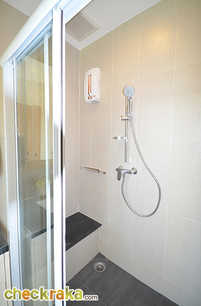 ส่วนขวามือของห้องน้ำใหญ่ก็จะเป็นส่วนเปียกพร้อม Rain Shower ฝักบัว และที่นั่งอาบน้ำค่ะ