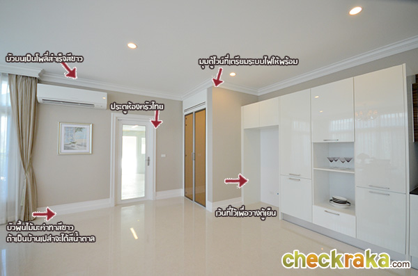 มุมพื้นที่หลัง Pantry มีบิ้วท์อินน์ตู้เก็บของ ตู้ไวน์มาให้พร้อม สังเกตที่ประตูห้องครัวไทยนะคะ