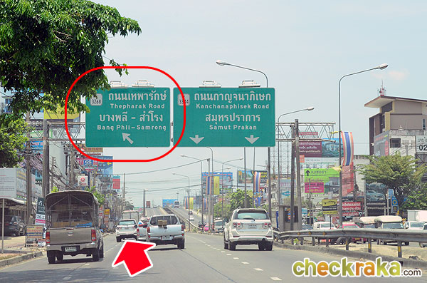 ตรงมาทางถนนศรีนครินทร์ พอถึงแยกศรีเทพา แล้วเตรียมชิดซ้าย ยึดป้าย "ถนนเทพารักษ์"