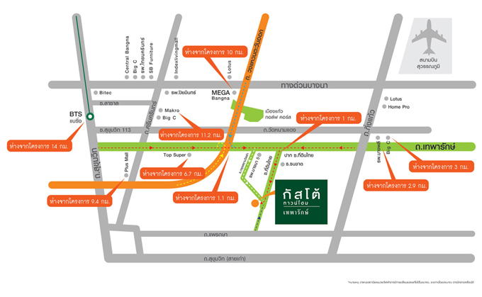 - ส่วนบริเวณรอบๆ โครงการ ถนนทางเข้าโครงการอาจไม่กว้างมากนัก และบางส่วนก็กำลังมีการทำถนนอยู่ ซึ่งในอนาคต เมื่องานทำถนนนี้เสร็จแล้ว การเดินทางเข้า-ออกโครงการก็น่าจะดีขึ้น บริเวณรอบๆ โครงการเป็นพื้นที่โล่งๆ ถ้าชอบบ้านแนวสงบ ก็อาจจะชอบแถวนี้นะคะ แต่ถ้าต้องการไปจับจ่ายใช้สอย ซื้อของเป็นจริงเป็นจัง หรือเดินเล่น ก็อาจจะต้องเดินทางออกมาเส้นถนนใหญ่เท่านั้น เช่น เทพารักษ์ หรือศรีนครินทร์ (เช่น Big C บางพลี, Mega Bangna, Makro และ Foodland เป็นต้น) โดยรวมแล้วถ้าสถาพแวดล้อมในระยะใกล้ๆ ก็ถือว่าปานกลาง ส่วนถ้าออกไประยะ 3-12 กม. ถือได้ว่ามีสิ่งอำนวยความสะดวกครบค่ะ