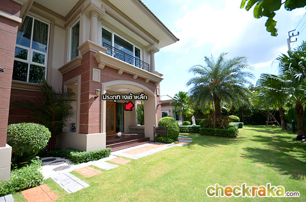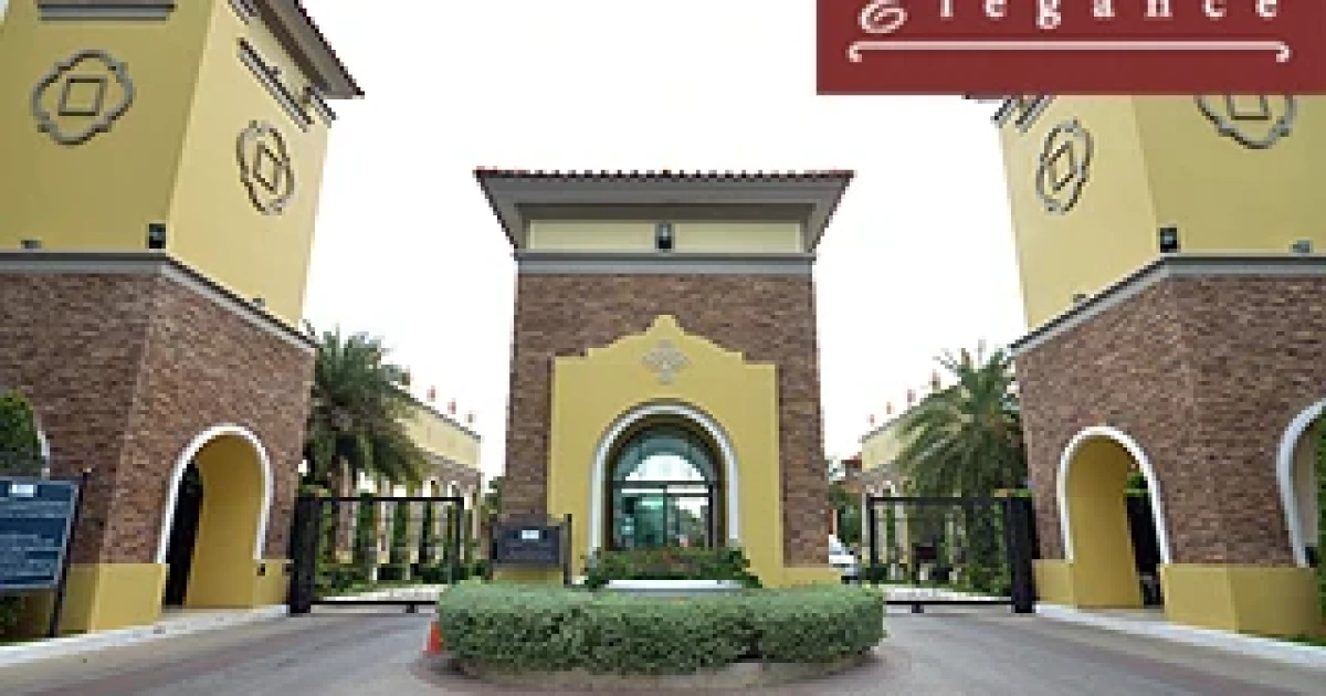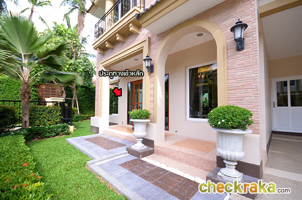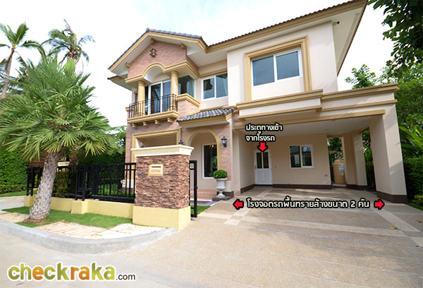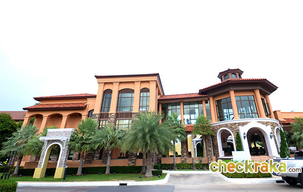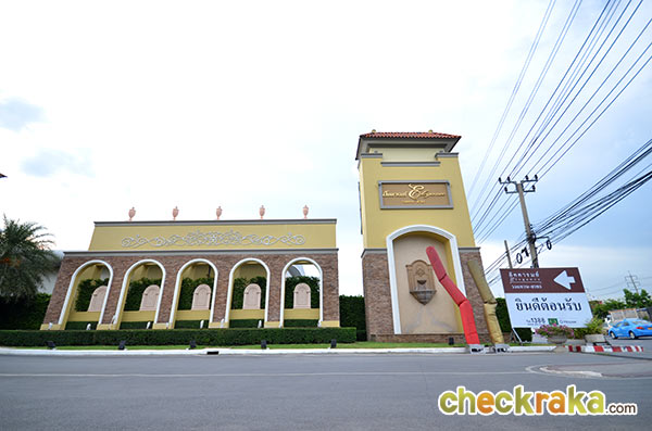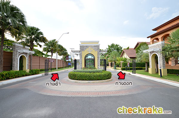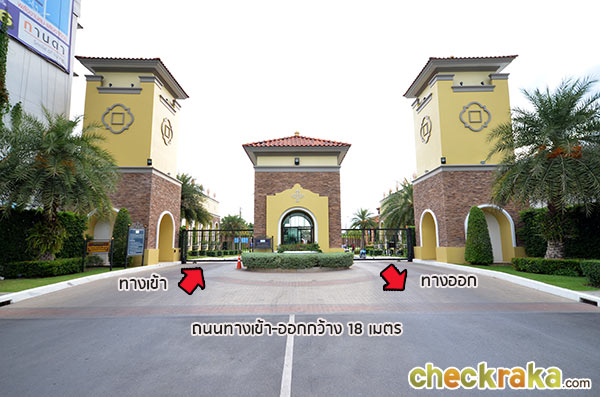 ทางเข้ากว้างขวาง ตกแต่งด้วยสถาปัตยกรรมสไตล์ทัสคานี ตั้งอยู่ติดถนนใหญ่กาญจนาภิเษก