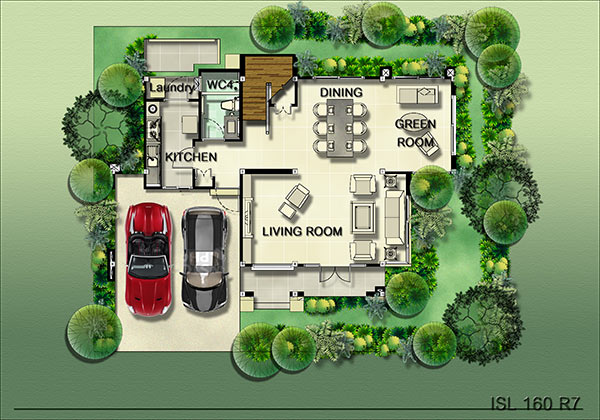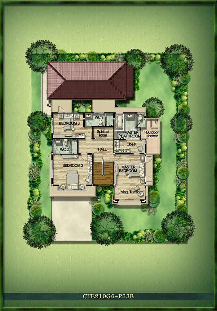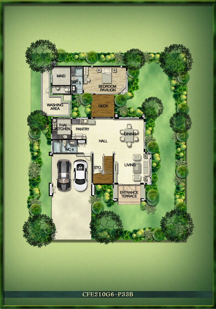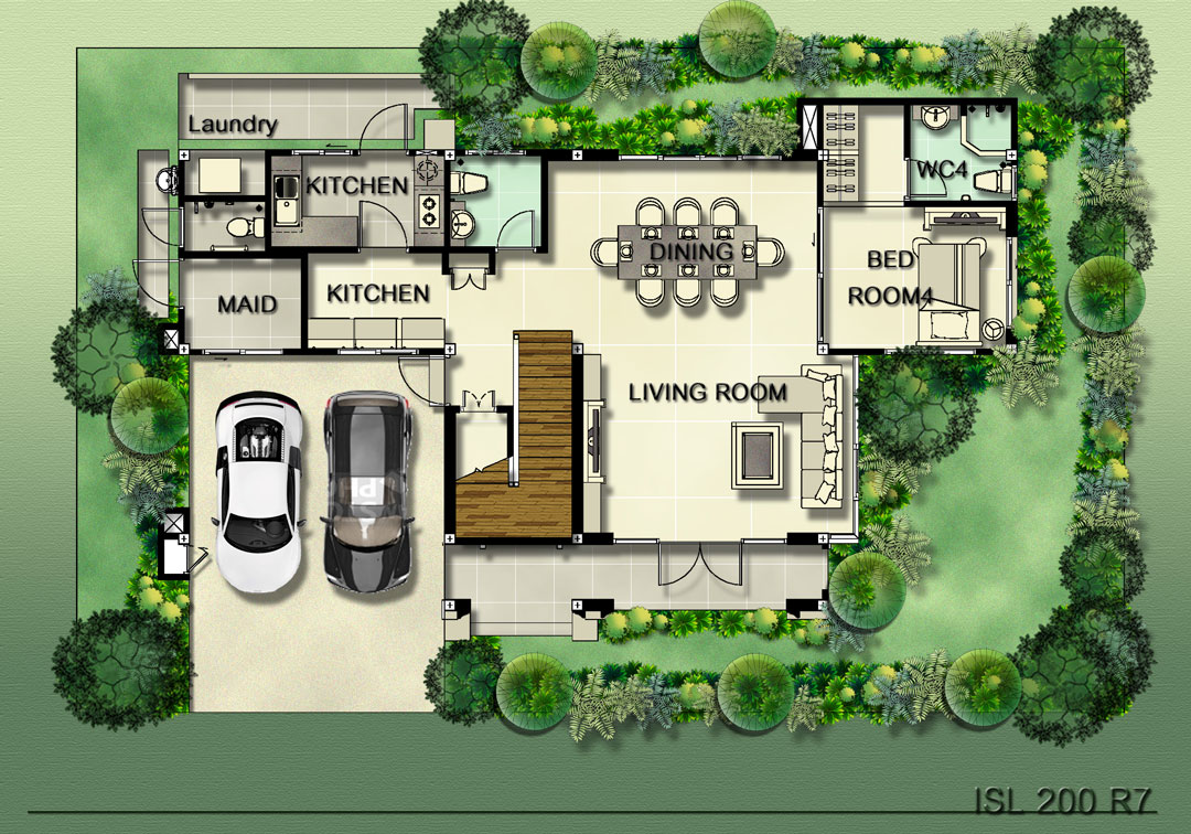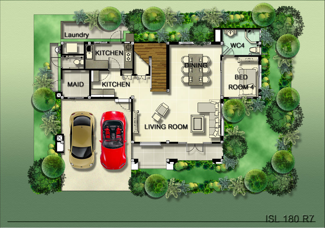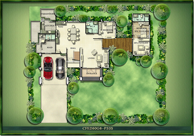 7) แบบบ้าน Siena พื้นที่ใช้สอย 383 ตร.ม. ขนาดที่ดินเริ่มต้น 207.8 ตร.วา ขนาด 4 ห้องนอน 4 ห้องน้ำ Spa Pavilion เรือนรับรองหรูเชื่อมต่อจากตัวบ้าน สระว่ายน้ำส่วนตัว Natural Bathroom ห้องน้ำท่ามกลางแมกไม้สบายตา ห้องแม่บ้าน