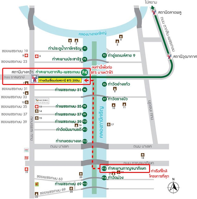 (โครงการนี้อยู่ในช่วงทดลองเดินเรือ ซึ่งจากหน้าโครงการสามารถนั่งไป BTS สถานีบางหว้าได้ เส้นทางเริ่มต้นจากท่าเรือประตูน้ำภาษีเจริญถึงท่าเรือเพชรเกษม 69 กำหนดเริ่มทดลองเดินเรือและเปิดให้บริการประชาชนฟรี ตั้งแต่วันที่ 24 เมษายน ถึงวันที่ 4 พฤศจิกายน 2557 ระยะทางรวมทั้งสิ้น 11.5 กิโลเมตร ท่าเรือสะพานกาญจนาภิเษกเป็นท่าเรือที่ใกล้กับโครงการมากที่สุด (ห่างจากทางเข้าออกโครงการประมาณ 300 เมตร) สามารถนั่งไปลงที่ท่าสะพานตากสิน-เพชรเกษมได้