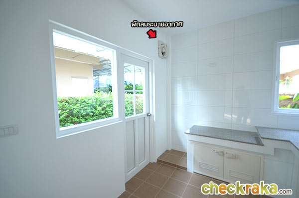 ภาพอีกมุมถ่ายให้เห็นประตูที่เปิดออกไปส่วนซักล้างหลังบ้าน และพัดลมระบายอากาศพร้อมรับศึกครัวไทย