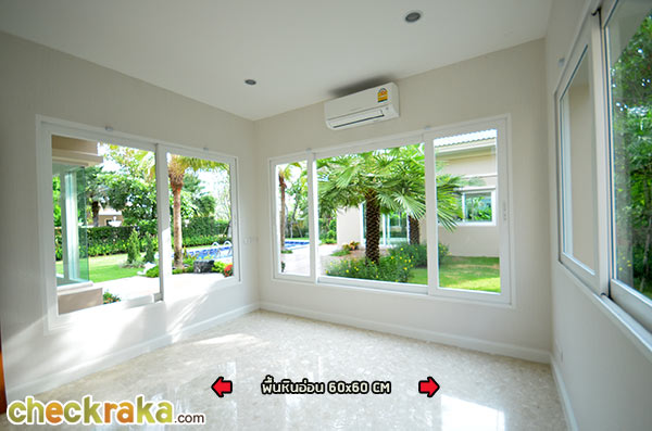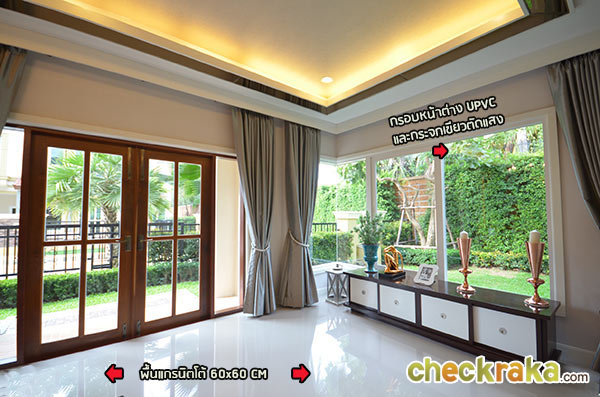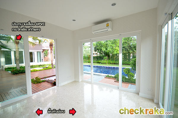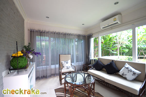 อีกฝั่งนึงของพื้นที่รับแขก สังเกตเห็นวิวสวนผ่านหน้าต่างบานใหญ่ของตัวบ้าน