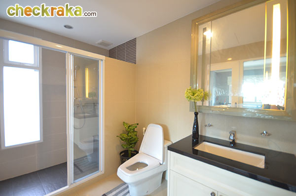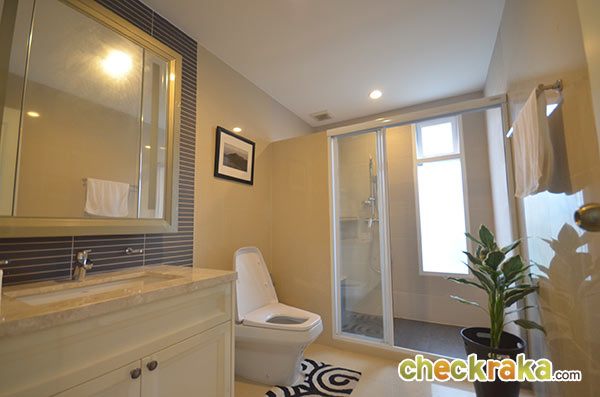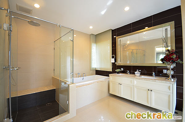 หรือยืน หรือนั่งในฉากกั้นอาบน้ำ ส่วนบริเวณกลางห้องตั้งเคาน์เตอร์อ่างล้างหน้าคู่ พร้อมกระจกเงาขนาดใหญ่