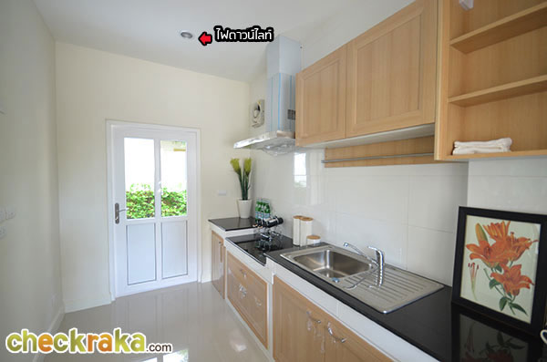 ส่วนพื้นที่ภายในครัวติดตั้งบิ้วท์อินเคาน์เตอร์ครัวติดผนัง ฮู้ดดูดควัน ซิ้งค์ล้างจาน