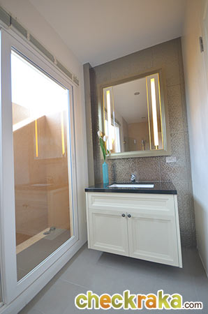 ฝั่งขวาเป็นมุมเคาน์เตอร์อ่างล้างหน้าพร้อมกระจก ส่วนประตูบานเลื่อนที่เห็น