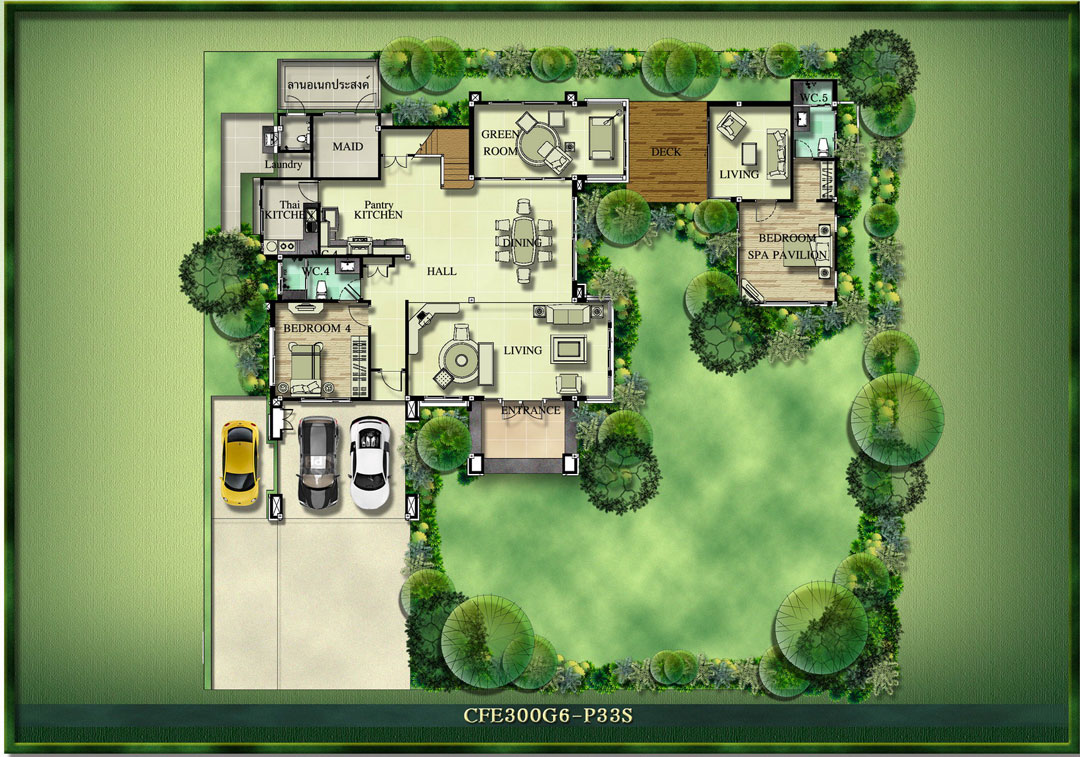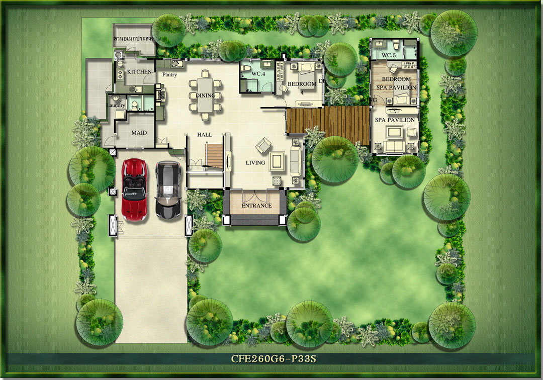 GREEN ROOM ห้องอเนกประสงค์ชมสวน Spa Pavilion เรือนรับรองหรูเชื่อมต่อจากตัวบ้าน Natural Bathroom ห้องน้ำท่ามกลางแมกไม้สบายตา ห้องแม่บ้าน ที่จอดรถ 2 คัน
