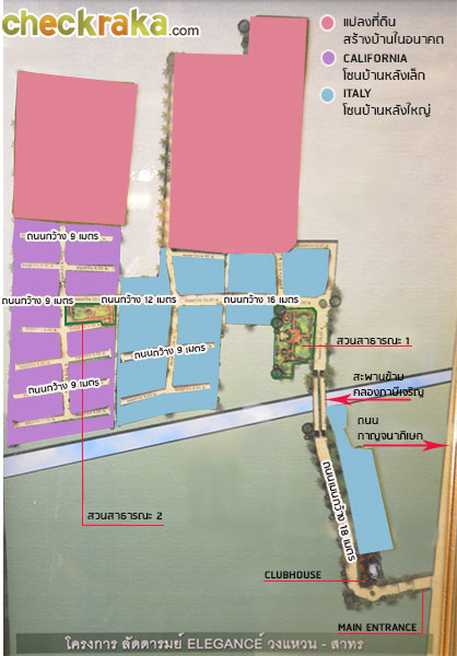 Master Plan พร้อมรายละเอียดของตำแหน่งทางเข้า ส่วนกลาง และโซนบ้านภายในโครงการ