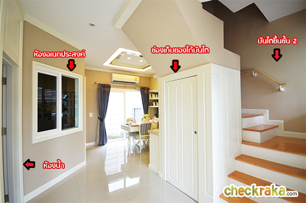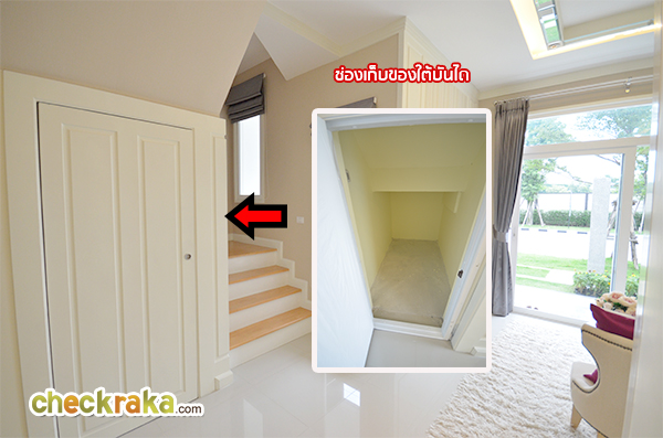 พื้นที่ใต้บันไดออกแบบให้เป็นช่องเก็บของ มีบานประตูสำหรับเปิด-ปิด