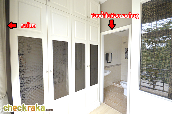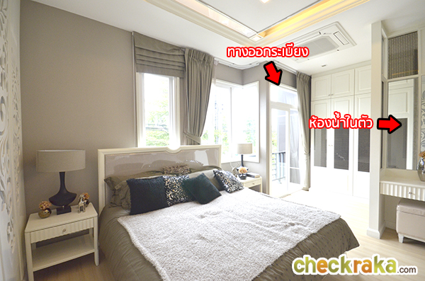 อีกมุมหนึ่งของห้องมาสเตอร์เบดรูม จะเห็นถึงทางออกระเบียงห้องนอน และห้องน้ำร่วมชั้น 2 ที่สามารถเปิดเข้าได้จากห้องนี้
