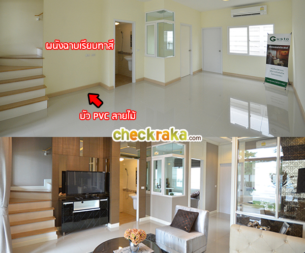 - แบบบ้านและวัสดุโดยรวม - รูปแบบบ้านมีหน้าตาที่คล้ายคลึงกับกัสโต้โครงการอื่นๆ ด้านหลังบ้านมีพื้นที่ค่อนข้างน้อย และอาจไม่ถูกใจสำหรับคนที่ชอบทำครัวไทย การจัดวางห้องภายในตัวบ้านถือว่าลงตัวในระดับหนึ่งโดยแบบบ้าน A และ B มีห้องอเนกประสงค์ชั้นล่างสามารถปรับเปลี่ยนเป็นห้องนอนที่ 4 ที่เหมาะสำหรับผู้สูงอายุที่ไม่สะดวกขึ้นบันไดไปชั้นบน วัสดุสุขภัณฑ์ใช้ของ Victor พื้นชั้นล่างเป็นแกรนิตโต้ 60x60 ซ.ม. พื้นชั้นบนเป็นลามิเนต 8 มม. ประตูบานเลื่อน UPVC และบานประตูห้องเป็น HDF บานประตู หน้าต่าง UPVC ของ Amigo ภายในห้องน้ำเลือกใช้สุขภัณฑ์นำเข้าแบรนด์ Victor โดยรวมแล้ววัสดุและเกรดของวัสดุค่อนข้างคล้ายคลึงกับโครงการอื่นๆของกัสโต้