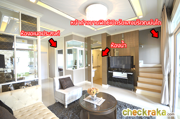 เปิดประตูเข้ามาภายในตัวบ้านจะพบกับส่วนรับแขกที่ให้ความรู้สึกโอ่โถงด้วยความสูงเพดานเกือบ 3 เมตร