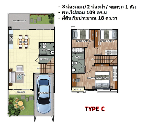3) TYPE C - หน้ากว้าง 5.70 เมตร พื้นที่ใช้สอย 109 ตร.ม. ขนาดที่ดิน 18.2-18.3 ตร.ว. 3 ห้องนอน 2 ห้องน้ำ และ 1 ที่จอดรถ (คลิกเพื่อดูแปลนบ้าน)