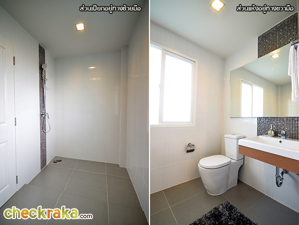 ด้วยการลดระดับพื้นให้ต่ำกว่าฝั่งโซนแห้งด้านขวามือ ส่วนการตกแต่งโดยรวมก็จะคล้ายกันกับห้องน้ำอื่นๆ ค่ะ