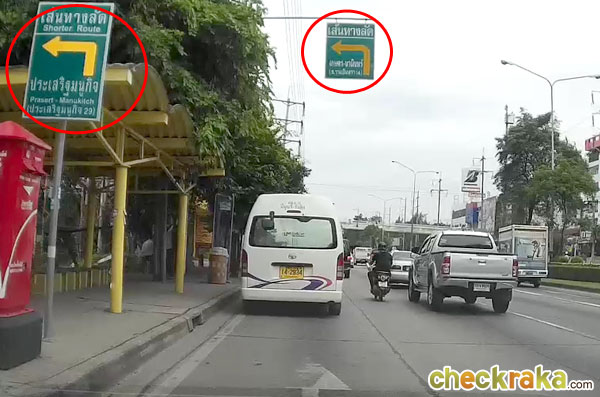 จะเริ่มเห็นป้ายรถเมล์ และป้ายเส้นทางลัดไปถนนประเสริฐมนูกิจ (เกษตร-นวมินทร์)