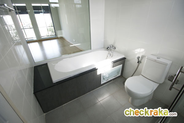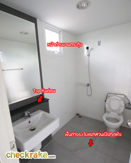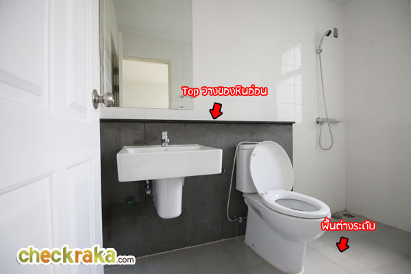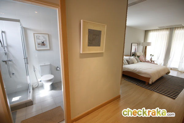 ห้องน้ำภายในห้องนี้มีสุขภัณฑ์ให้ครบ พร้อมกับส่วนอาบน้ำมีพื้นต่างระดับแยกไว้