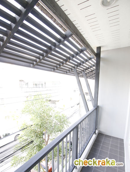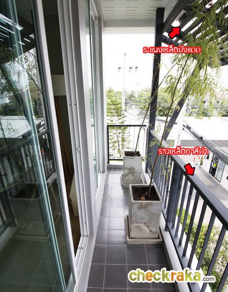 ปลูกต้นที่ไม่ใหญ่มากเพื่อความสบายตาได้เลยค่ะ อีกทั้งยังมีราวเหล็กกันตกและระแนงเหล็กบังแดด