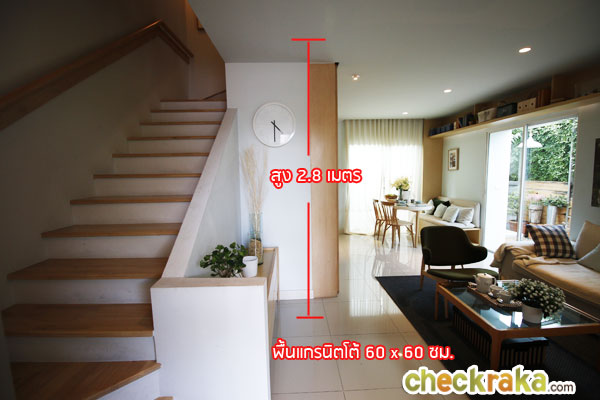 เข้ามาข้างในเป็นพื้นแกรนิตโต้ 60 x 60 ซม. ไฟเป็นโคมไฟซาลาเปา ส่วนผนังฉาบเรียบทาสีขาว