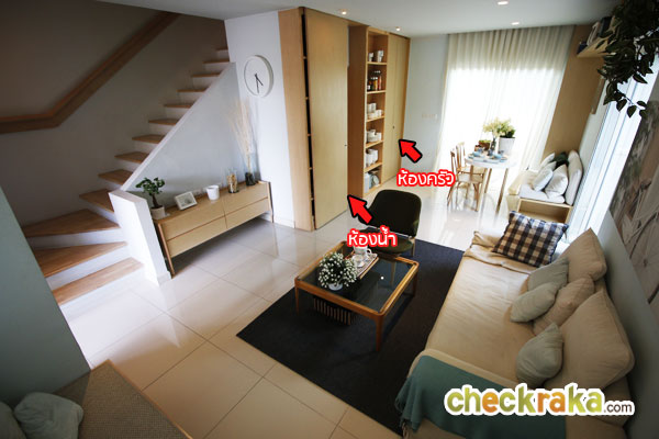 มองจากมุมนี้จะเห็นพื้นที่ด้านล่างชัดเจนขึ้น พื้นที่ส่วนครัวจะเปิดโล่งให้ลูกค้าตกแต่งเอง ไม่ได้กั้นประตูให้