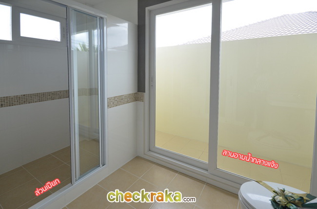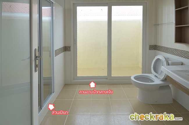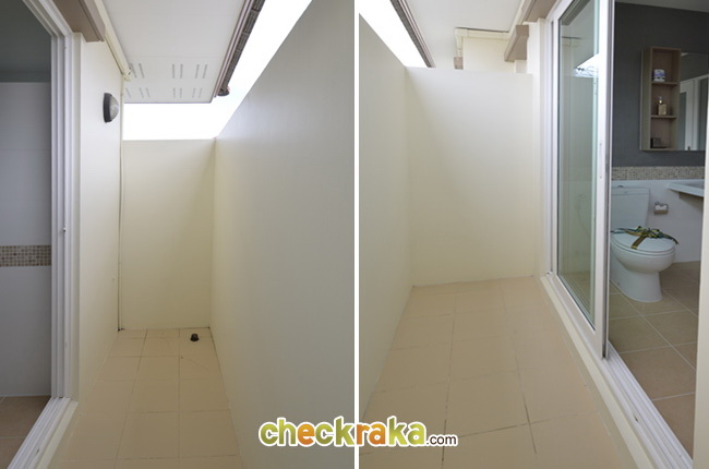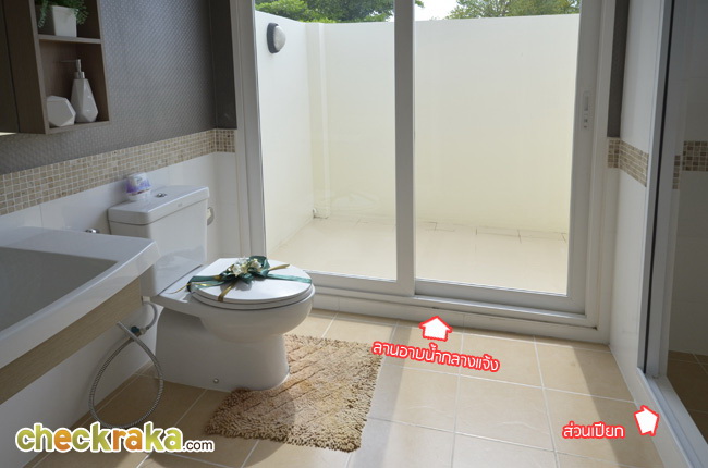 ส่วนเปียกจะอยู่ด้านซ้ายมือ กั้นเป็นห้องเปิดปิดด้วยประตูบานเลื่อน 3 ชั้น ส่วนที่เป็นลานกลางแจ้งนั้น จะเอาไว้ทำเป็นลานอาบน้ำกลางแจ้งก็ได้บรรยากาศดีค่ะ หรือจะตกแต่งเป็นสวนก็ได้ ทำเป็นที่ตากผ้าก็ได้ตามแต่ใจเจ้าของบ้านเลยค่ะ