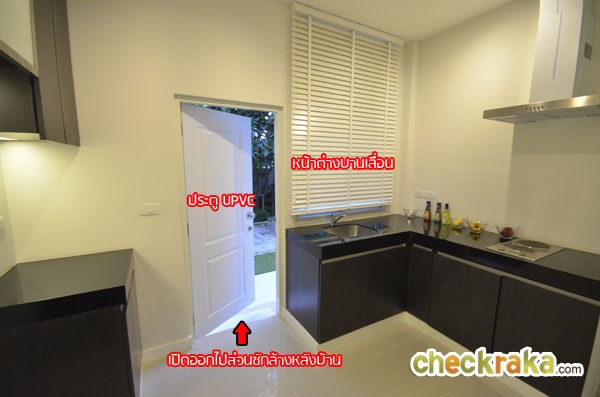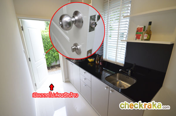 ประตูครัวเป็นแบบบ้านเลื่อนช่วยเก็บกลิ่นที่จะเข้าไปในตัวบ้านได้ดีกว่าประตูปกติ