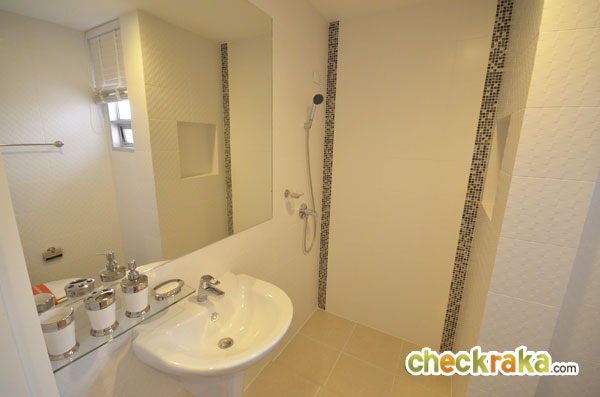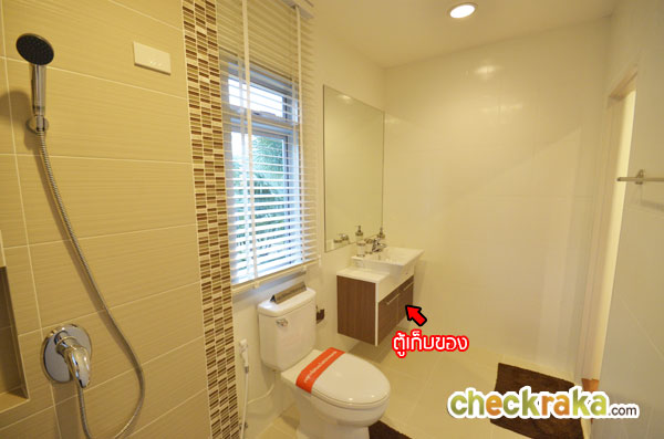 อ่างล้างหน้ามีตู้เก็บของให้ พร้อมหน้าต่างเปิดระบายอากาศได้ทั้งบนและล่าง